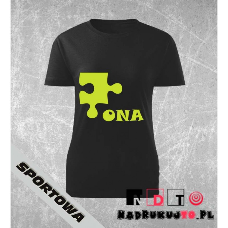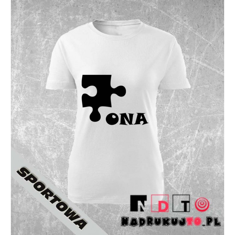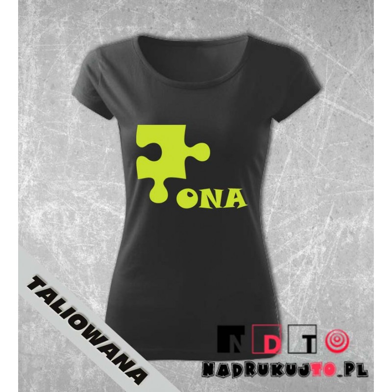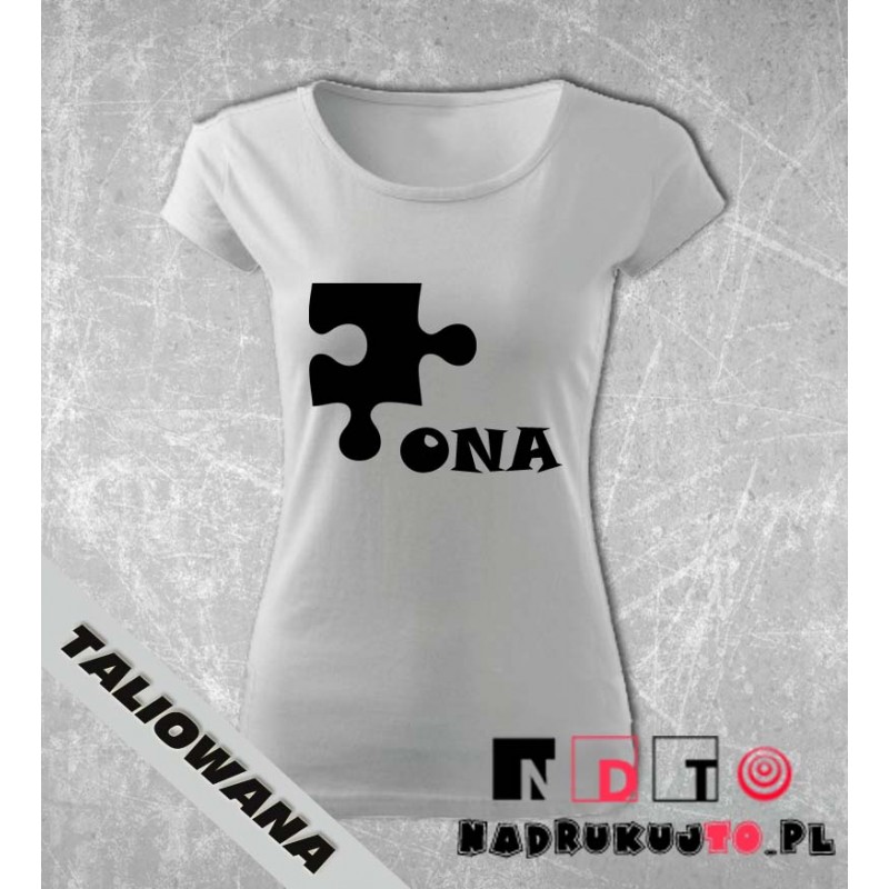 Koszulka damska z nadrukiem puzel i napisem ONA. Część układanki razem z męską koszulką - doskonały prezent na Walentynki.