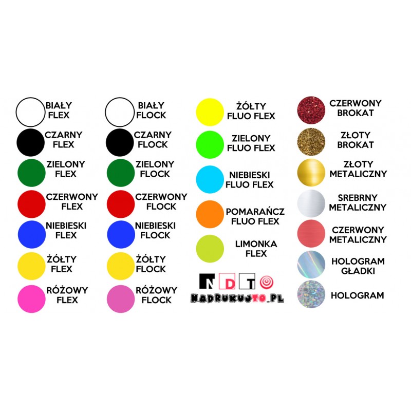 - Dodatkowo można wybrać materiał nadruku FLOCK (delikatny meszek) lub FLEX (gładki nadruk) oraz określić kolor nadruk