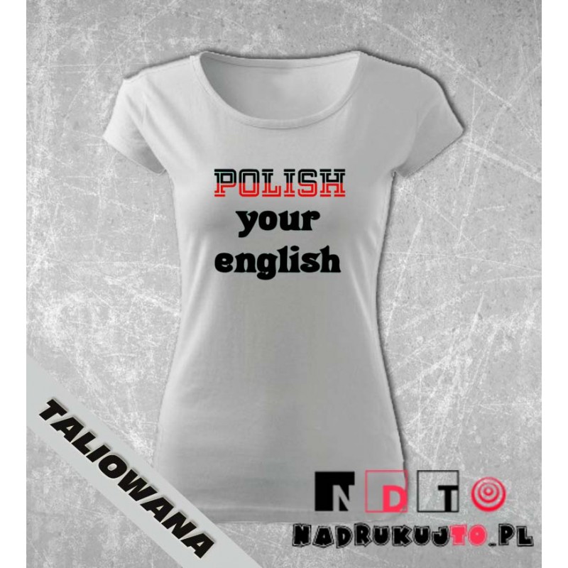 Koszulka z nadrukiem z zabawnym wzorem - polish your english. Świetnej jakości materiały i nigdy nie blaknący nadruk.