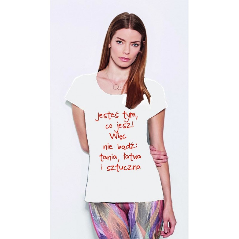 Koszulka damska z nadrukiem - Jesteś tym co jesz! Więc nie bądź tania, łatwa i sztuczna.