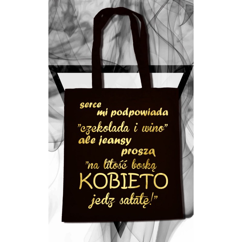 Ekologiczna torba bawełniana z unikatowym napisem: Serce mi podpowiada "czekolada i wino" ale jeansy proszą "na litość boską KOBIETO jedz sałatę!"