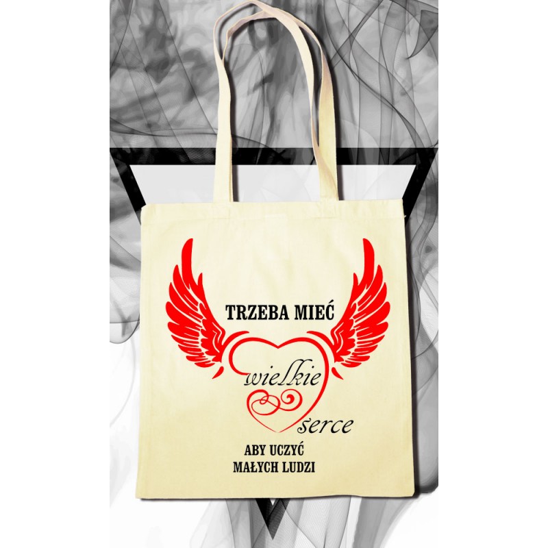 Ekologiczna torba bawełniana z unikatowym napisem: Trzeba mieć wielkie serce, aby uczyć małych ludzi